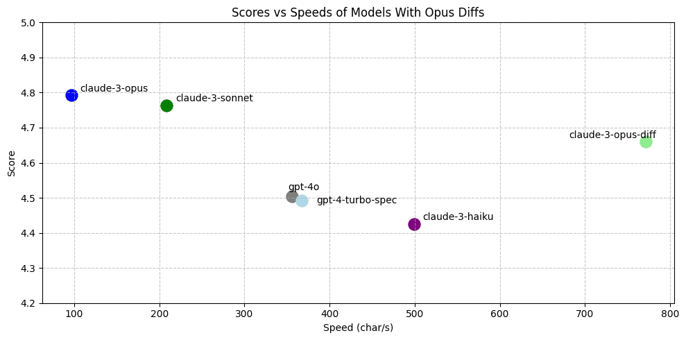 claude-3-opus-diff is Claude Opus prompted with a modified version of Aider's diff format. It beats gpt-4-turbo-spec on speed and accuracy. gpt-4o-diff is omitted from the graph as it achieves a median speed of 2476 char/s, but performs far worse than claude-3-haiku (4.18 avg eval score).