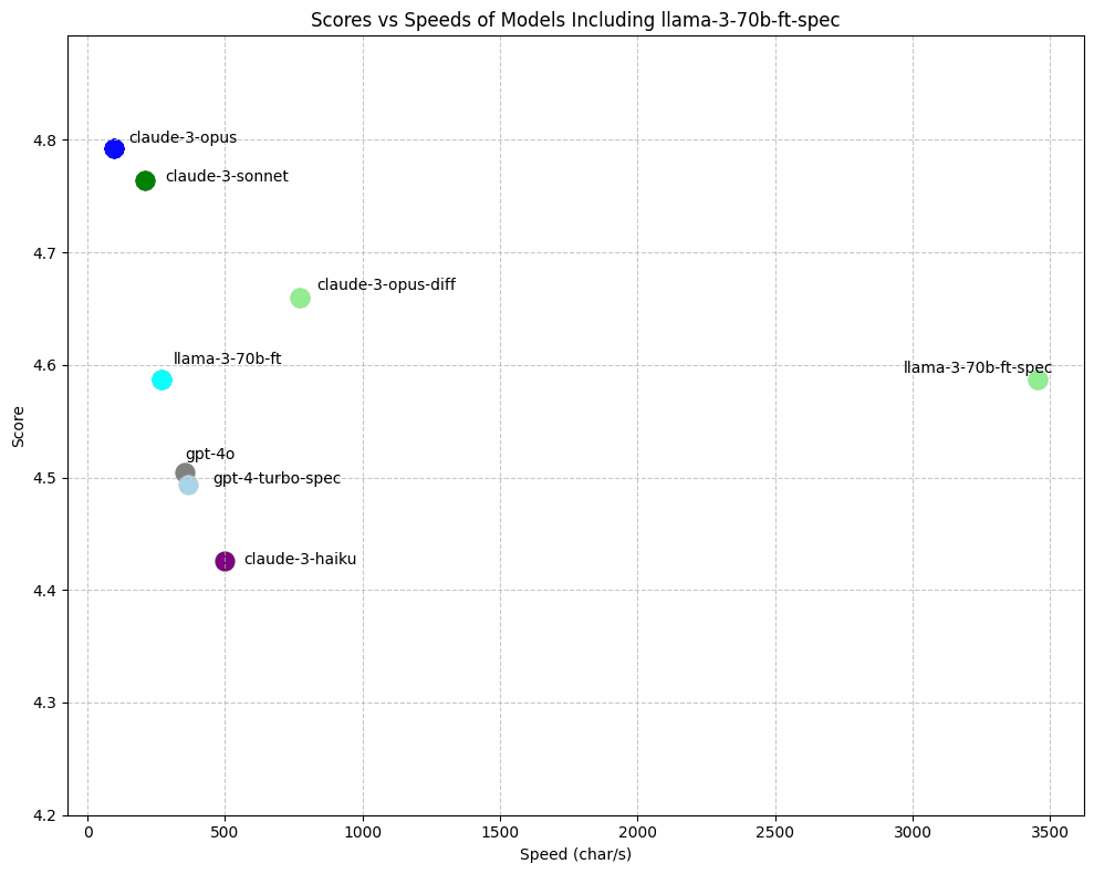 With speculative edits, gpt-4-turbo performs similarly to gpt-4o. Speculative edits are not yet possible with gpt-4o, otherwise gpt-4o-spec would be the speed frontrunner.